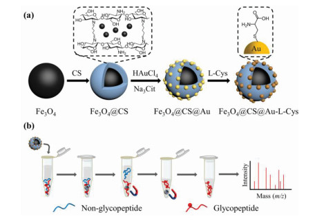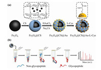 | Scheme 1. (a) Synthesis process of Fe3O4@CS@Au-L-Cys and (b) typical enrichment process of glycopeptides by Fe3O4@CS@Au-L-Cys. | |