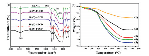 | Fig. 1. (a) FT-IR spectra of CSPs. (b) Thermogravimetric weight loss curves of Sil-NH2 (1), Sil-(S)-ATCD (2), Sil-(S)-PCCD (3), Sil-(S)-PTCD (4), and Sil-(S)ACCD (5). | |