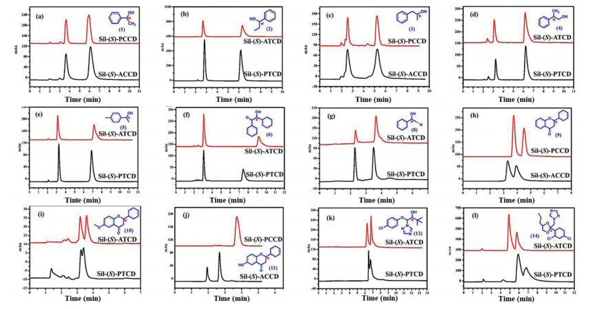 Chiral enantiomers, especially chiral pesticide enantiomers, often show significant differences and even opposite effects in pharmacological activity, metabolism and toxicity. Among numerous enantiomers, aryl alcohol is known as an essential block for enantiopure compounds, pharmaceuticals and bioactive compounds [12-16]. Efficient preparation of chiral aryl alcohols with high optical purity as precursors has become an important subject for drug researchers. 1-phenylethanol and 1-phenyl-2-propanol were well separated on β-CD-silica [17]. 3–Chloro-4-methylphenylcarbamate-β-CD bonded silica showed excellent separation for aryl alcohols [18]. Decomposition mechanisms of chiral pesticide are also different, at least 40% of pesticides have chiral structure, while only 7% are sold as a single enantiomer [19, 20]. Among chiral pesticides, flavanone is an important antitoxin, which showed bioactivities like anti-inflammatory, antioxidant and antibacterial [21-29]. Triazoles with stereogenic centers are widely used in agricultural field [30-34]. These enantiomers can lead to important consequences regarding their bioactivity [35, 36]. Usually only one enantiomer has highly fungicidally active and another possesses very low, even no activity [37-41]. Therefore, it is essential to promote efficient separation of chiral pesticides [42-46].