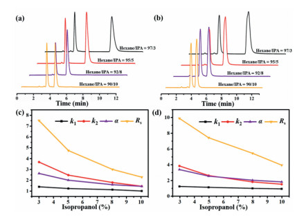 | Fig. 3. Enantioseparation of 1-phenyl ethanol for different concentrations of IPA on Sil-(S)-PCCD (a) and Sil-(S)-PTCD (b). The influence of IPA content on retention and selectivity of 1-phenyl ethanol on Sil-(S)-PCCD (c) and Sil-(S)-PTCD (d). | |