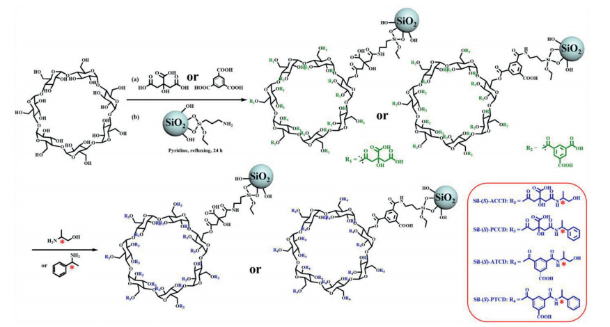 | Scheme 1. Preparation of chiral phenethylamine synergistic tricarboxylic acid modified β-CD CSPs. | |