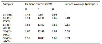 Elemental analysis exhibited that the content of C increased sharply after β-CD and its derivatives were bonded on Sil-NH2 (Table 1). The corresponding N and H contents were also increased in comparison with Sil-NH2. These results indicated successful formation of chemical linkages between the Sil-NH2 and chiral nitrogen source. The surface coverage was calculated to be 0.10 µmol/m2 for Sil-(S)-PCCD, 0.13 µmol/m2 for Sil-(S)-ACCD, 0.08 µmol/m2 for Sil-(S)-PTCD and 0.09 µmol/m2 for Sil-(S)-ATCD. According to literature [47]: [C%/(12 × Nc × S-silica)] × 106, where C% is the percentage of carbon, Nc is the carbon atom number of per β-CD molecule, and S-silica (329 m2/g) is the surface area of amino silica.
