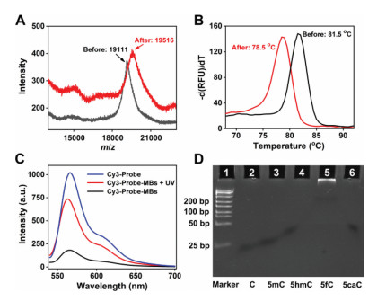 | Fig. 2. (A) MALDI-TOF MS characterization of 5fC-DNA before (black line) and after (red line) biotinylation treatment. (B) Melting curves for double-stranded 5fC-DNA before (black line) and after (red line) biotinylation treatment. (C) Fluorescence intensities of supernatants of Cy3-Probe, Cy3-Probe-MBs with/without UV irradiation. (D) PAGE analysis of extended products from C-, 5mC-, 5hmC-, 5fC-, and 5caC-DNA after biotinylation, enrichment and photocleavage processes. | |