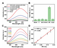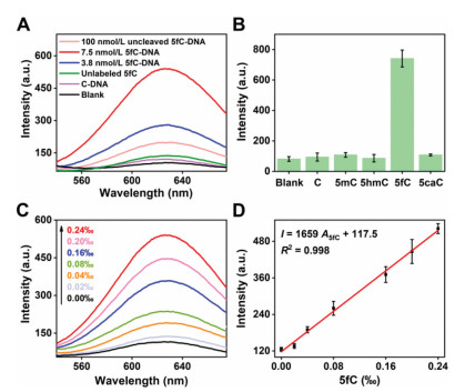 | Fig. 3. (A) Fluorescence responses of 5fC-PTIAS assay to different samples. (B) Histogram of fluorescence intensities in response to 10 nmol/L C-, 5mC-, 5hmC-, 5fC-, and 5caC-DNA. (C) Fluorescence responses of 5fC-PTIAS assay to different 5fC levels in DNA models. (D) Linear plots of fluorescence intensities versus 5fC levels in DNA models. | |