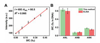 | Fig. 4. (A) Linear plots of fluorescence intensities versus genomic 5fC levels in newborn mouse brain. (B) Detection of 5fC in genomic DNA extracted from different mouse tissues by this method and the ELISA kit. | |