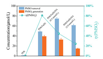 Based on the steady-state concentrations and reaction rate constants of HA with Fe(Ⅲ), FeⅣO2+, SO4•− and •OH, it could be inferred that HA reacted mainly with Fe(Ⅲ) and some FeⅣO2+ in Fe(Ⅱ)/HA(0.5 mmol/L)/PDS system, while the scavenging effect of HA to SO4•− and •OH might be neglected. Therefore, although the total ROS could be elevated when 0.5 mmol/L HA was added to the Fe(Ⅱ)/PDS system, the molar ratio of FeⅣO2+ to free radicals decreased. These results led to increased PMSO removal but a significant decrease in η(PSMO2).