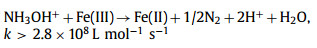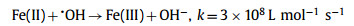 HA could accelerate the Fe(Ⅲ)/Fe(Ⅱ) cycle (Eq. 6) [4, 20] to enhance the PDS activation, but it also could scavenge some ROS generated in Fe(Ⅱ)/PDS system. At pH 3.0, HA was mainly present as NH3OH+ [10], and the reaction rate constants of HA with FeⅣO2+, SO4•− and •OH were approximately 5.0 × 108 L mol−1 s−1, 1.5 × 107 L mol−1 s−1, and 1.15 × 108 L mol−1 s−1, respectively [10, 16]. Furthermore, considering the steady-state concentrations of SO4•−/•OH (~10−13 mol/L) and FeⅣO2+ (~10−8 mol/L) in the Fe(Ⅱ)/PDS system (Text S3 and Fig. S3 in Supporting information), HA would preferentially scavenge FeⅣO2+. This inhibited the production of FeⅣO2+ in the Fe(Ⅱ)/PDS system. However, the reaction rate constant of HA with Fe(Ⅲ) was about 2.8 × 108 L mol−1 s−1 [4], so the presence of Fe(Ⅲ) would interfere with the scavenging effect of HA on these ROS.