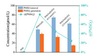 | Fig. 1. Effect of HA on PMSO removal, PMSO2 production and the corresponding η(PMSO2) in Fe(Ⅱ)/PDS system. Experimental condition: Initial pH 3.0, [PDS] = 0.5 mmol/L, [PMSO] = 0.1 mmol/L, [Fe(Ⅱ)] = 0.1 mmol/L. | |