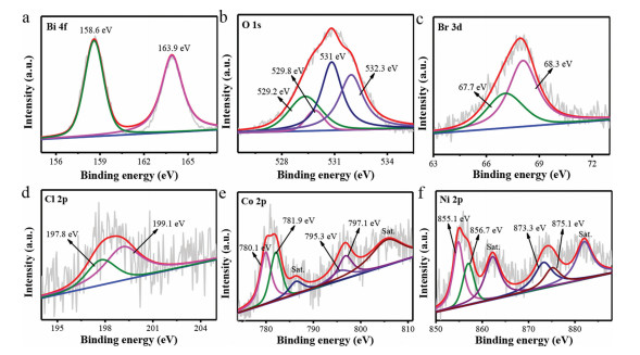 | Fig. 2. High-resolution XPS of Bi 4f (a), O 1s (b), Br 3d (c), Cl 2p (d), Co 2p (e) and Ni 2p (f), respectively. | |