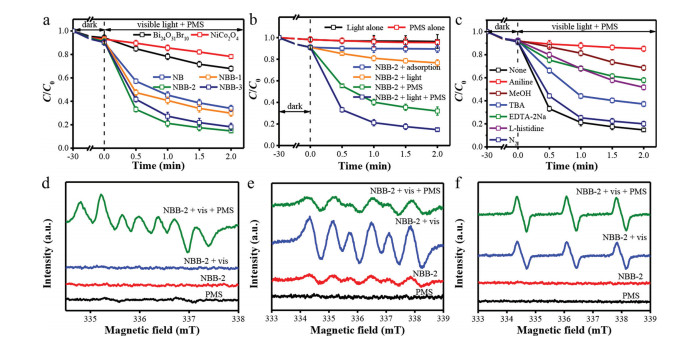 | Fig. 3. (a) TCH degradation performance of the synthesized samples under PMS/vis system. (b) The effect of reaction protocols of TCH on NBB-2 performance. (c) Free radical scavenger experiments with NBB-2 in vis/PMS system. ESR spectra in different systems: (d) •OH and SO4•−-DMPO in water, (e) •O2−-DMPO in methanol, and (f) 1O2-TEMP in water. | |
