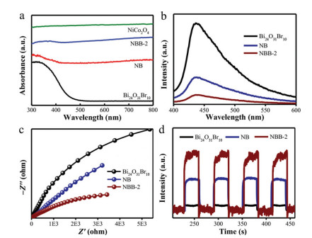 | Fig. 4. (a) UV–vis DRS of as-prepared samples. (b) PL, (c) EIS Nyquist plots and (d) photocurrent of pristine Bi24O31Br10, NB and NBB-2. | |