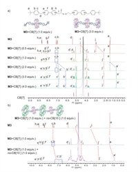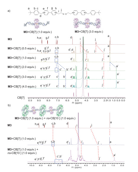 | Fig. 3. (a) 1H NMR spectra (400 MHz) of the mixture of M3 (1.0 mmol/L) and CB[7] of various amount (0 to 4.0 equiv.) in D2O at 25 ℃. (b) 1H NMR spectra (400 MHz) of free M3, M3+CB[7] (1.0 equiv.) and M3 + CB[7] (1.0 equiv.) + ns-CB[10] (1.0 equiv.) in D2O at 25 ℃. | |