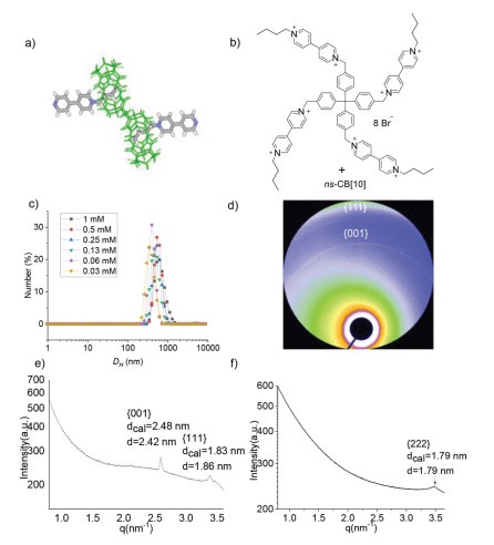 | Fig. 4. (a) The crystal structure of [G1]2@ns-CB[10]. (b) Compound structure of T1. (c) The hydrodynamic diameters of the aggregates of ns-SOF-Bu at different concentrations in water at 25 ℃. (d) Solid-phase 2D SAXS image of ns-SOF-Bu. (e) Solid-phase SAXS profiles of ns-SOF-Bu. (f) Solution-phase profiles of ns-SOF-Bu. | |