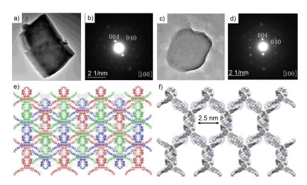 | Fig. 5. (a, c) Microcrystals of ns-SOF-Bu as recorded by TEM, and (b, d) their SAED patterns which showed the reciprocal lattice observed for the [100] facet and foursquare order. (e) Model structure of ns-SOF-Bu in solid, and (f) model structure of ns-SOF-Bu in solution. | |