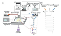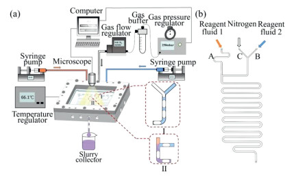 | Fig. 1. Illustration of experimental setup for liquid-gas heterogeneous microreactor. (a) The schematic diagram of microreactor apparatus for dolutegravir sodium continuous crystallization. The magnified image Ⅰ represents the Y-junction flow pattern of nitrogen and sodium hydroxide. Ⅱ is the mixture of liquid-gas flow and dolutegravir within T-junction structure. Orange area and blue area of syringe pump represent dolutegravir (DTG-7) dissolved in iso-propyl alcohol and sodium hydroxide solution, respectively. (b) The microreactor glass chip with microchannels sealed in manifold is displayed perpendicular to the microscope view. | |