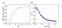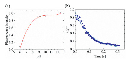 | Fig. 3. The processing of experimental data plots for reaction kinetics parameters. (a) Fluorescence light intensity as a calibration curve of pH value. (b) Concentration profiles (C/C0) at selecting certain analysis distance for reaction time of sodium hydroxide downstream. | |