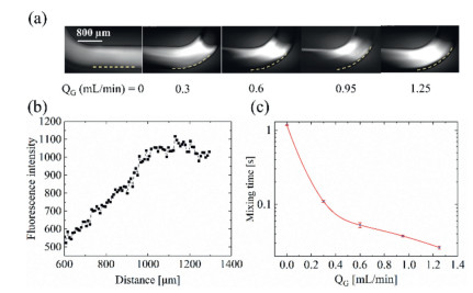 | Fig. 4. The effect of varying gas flow rates on mixing performance of the two fluids. (a) Internal fluorescence light intensity distribution captured by camera corresponds to changes of local concentrations. Yellow dashed curves designate measuring parts. (b) Changing tendency of emitted fluorescence intensity is analyzed by ImageJ at selected mixing distances. (c) Fitting curve for the relation between gas flow rate and mixing time in microchannel. | |