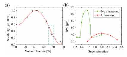 | Fig. 5. Investigating the effect of initial supersaturation on crystal size. (a) The change of DTG solubility along with iso-propyl alcohol at 66.1 ℃ in the mixture of ultrapure water and iso-propyl alcohol. (b) Crystal D90 as tendency curves of initial supersaturation at conditions of ultrasound and without ultrasound. | |