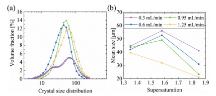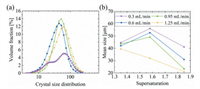 | Fig. 6. The effect of gas flow rate on continuous crystallization. (a) Effect of different gas flow rates on crystal size distribution. (b) Effect of gas flow rate on crystal mean size at initial supersaturation of 1.35 mL/min, 1.58 mL/min, 1.85 mL/min. | |