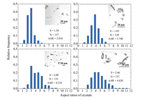 | Fig. 7. The crystal aspect ratio distributions and microscope images for four initial supersaturations of DTG. The crystals in images are randomly selected for measurement. S, N severally represent initial supersaturation and the counted number of crystals. AAR means average aspect ratio of crystals. | |