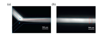 | Fig. 2. pH-sensitive dye indicates in situ the reaction kinetics of the dolutegravir with sodium hydroxide under steady-state conditions. (a) The blue arrows represent the direction of inlet streams entering Y-junction microchannel. Light region and dark region mean NaOH solution and dolutegravir solution, respectively. Fluorescence light intensity of red dashed line along axial direction of microchannel was selected for indicating changes of time and sodium hydroxide concentration. (b) Red dashed rectangle area represents the end of reaction process downstream. | |