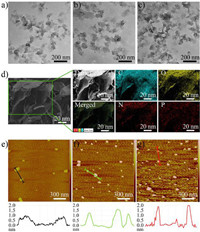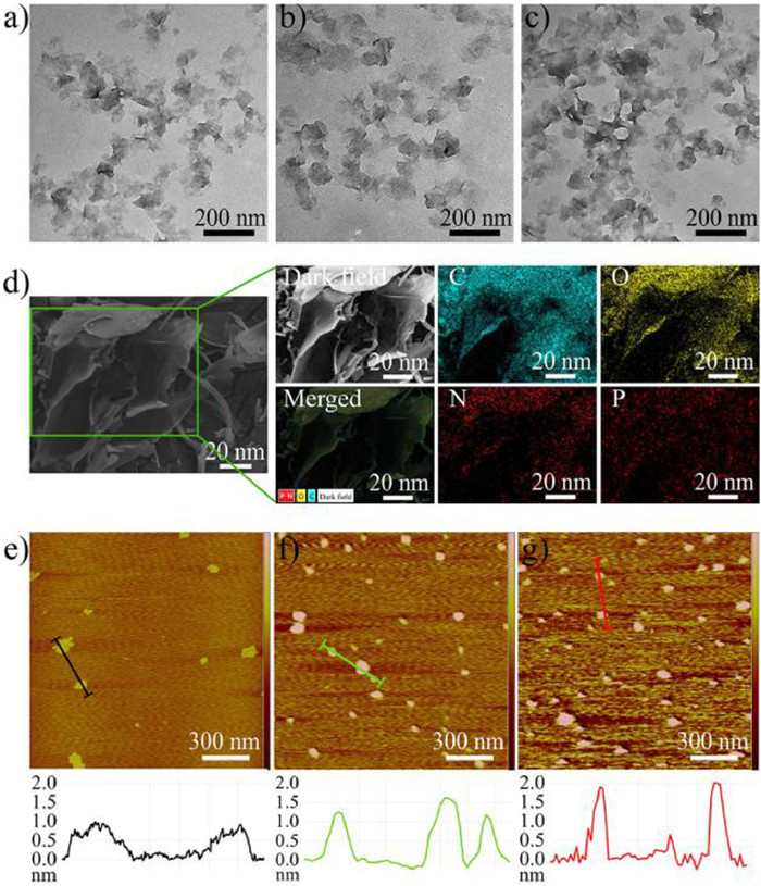 | Fig. 1. TEM images of (a) GO, (b) GO-Arg and (c) GO-Arg-SL. (d) SEM, element mapping and merged images of GO-Arg-SL by EDS analysis. Representative AFM images and height profiles of (e) GO, (f) GO-Arg and (g) GO-Arg-SL based on AFM analysis. | |
