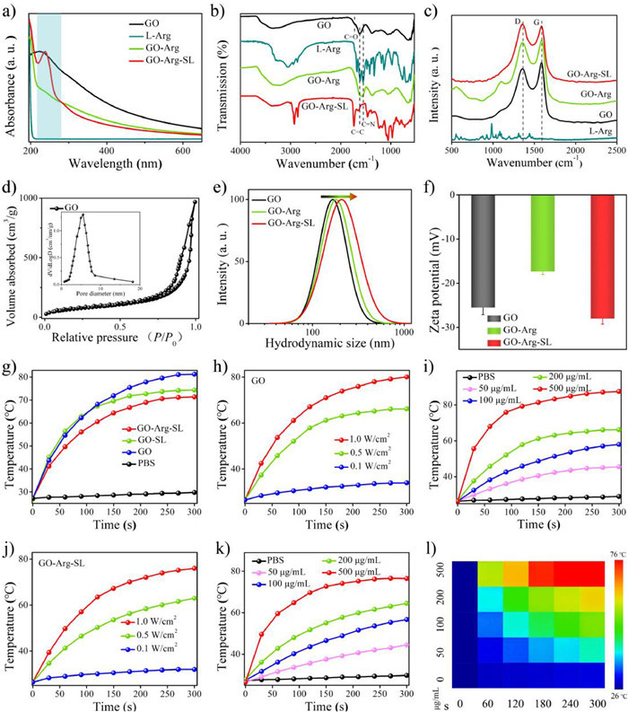 | Fig. 2. (a) UV-vis, (b) FTIR and (c) Raman spectra of GO, L-Arg, GO-Arg and GO-Arg-SL. (d) Nitrogen adsorption-desorption and pore size distribution of GO. (e) Size distribution and (f) zeta potential of GO, GO-Arg, and GO-Arg-SL. (g) Photothermal curve of different formulations with 808 nm laser irradiation. Temperature curve of (h) GO and (j) GO-Arg-SL under 808 nm laser irradiation with different power density. (i) Temperature curve of GO with different concentrations under 808 nm laser irradiation for various times. (k) Temperature curve and (l) photothermal images of GO-Arg-SL with different concentrations under 808 nm laser irradiation for various times. | |