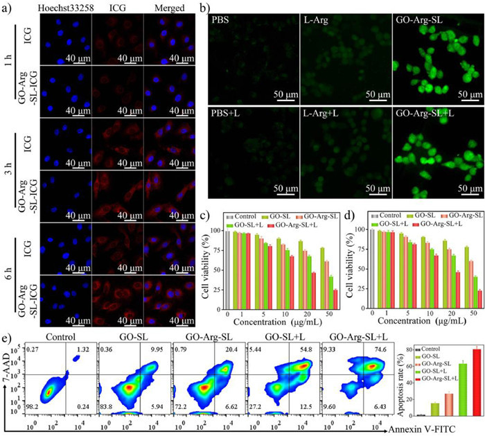 | Fig. 3. (a) CLSM images of 4T1 cells after incubation with GO-Arg-SL-ICG and ICG for different time. Scale bars: 40 µm. (b) CLSM images of intracellular NO in groups of PBS, free L-Arg, GO-Arg-SL without and with 808 nm laser irradiation, respectively. Scale bars: 50 µm. Cell viability of (c) 4T1 cells and (d) A549 cells after PBS (control), GO-SL, GO-Arg-SL, GO-SL+L and GO-Arg-SL+L treatments under various concentrations. (e) Flow cytometry studies and quantitative analysis of PBS+L (control), GO-SL, GO-Arg-SL, GO-SL+L and GO-Arg-SL+L induced apoptosis/necrosis in 4T1 cells. | |