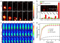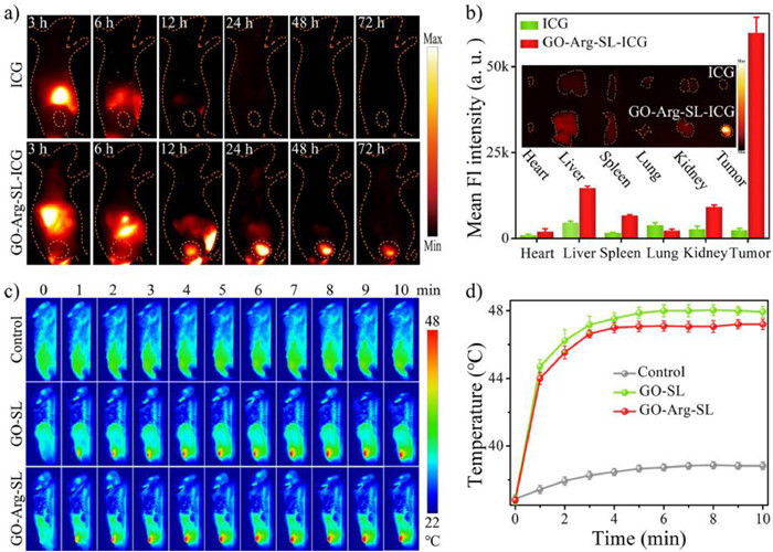 | Fig. 4. (a) NIR-II fluorescence images of tumor-bearing BALB/c mouse after intravenous injection of ICG and GO-Arg-SL-ICG at different time points. (b) The quantitative analysis of NIR-II signal intensity of major organs and tumors in BALB/c mouse after intravenous injection of ICG and GO-Arg-SL-ICG at 24 h. Insert, ex vivo NIR-II fluorescent image of major organs and tumors. (c) Photothermal images of BALB/c mouse with 808 nm laser illumination for various times after 24 h intravenous injection of PBS (control), GO-SL and GO-Arg-SL. (d) Reprehensive temperature increase curve of photothermal images in the above three groups. | |