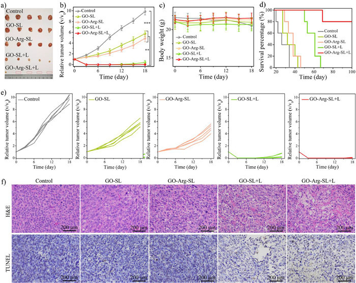Attested by the excellent tumor accumulation of GO-Arg-SL after intravenous administration, we next performed the antitumor effect of GO-Arg-SL in vivo. BALB/c mice with subcutaneous 4T1 breast tumor (n = 5) have been intravenously vaccinated with PBS+L (control), GO-SL, GO-Arg-SL, GO-SL+L and GO-Arg-SL+L, respectively. All GO-based administration groups had the same equivalent GO-Arg-SL concentration (10 mg/kg). Tumor volume, body weight, and surviving mice were recorded every three days. As shown in Figs. 5a and b, and Fig. S9, in contrast with the control group, the tumor outline and tumor volume in GO-Arg-SL treated mice displayed some extent antitumor effect while still presenting homologous tumor growth trend as GO-SL. Contrarily, GO-SL+L and GO-SL-Arg+L administrated tumors were clearly smaller or totally disappeared with tumor volume significantly reduced (Figs. 5a and b, Fig. S10 in Supporting information). Interestingly, tumor recurrence can be detected after 12 days of treatment in GO-SL+L group, reflecting that even PTT can be an effective local antitumor modality, but it might not completely eradiation all tumor cells, resulting in tumor recurrence or metastasis (Figs. 5a, b and e, and Fig. S10). The above result further proved single PTT or GT was inadequate for effective tumor eradication. Finally, tumor cell apoptosis status was further analyzed by hematoxylin & eosin (H & E) and terminal deoxynucleotidyl transferase dUTP nick end labeling (TUNEL) staining analysis. In contrast, remarkable loosen tumor cells and apoptotic cells were found in GO-SL-Arg+L group with strikingly higher survival rate in comparison with other formulations (Figs. 5d and f). Meanwhile, no body weight variation, little biochemistry fluctuations, and negligible blood routines alternation and pathological changes were found during the whole treated procedure, indicating the biocompatibility and low side effect of the GO-based nanomaterials (Fig. 5c and Figs. S11–S13 in Supporting information). Exactly, 7 days in our work was insufficient for a long-term toxicity evaluation and the systemic toxicity of our GO-Arg-SL with long time durations will be comprehensively studied in the future. Collectively, the above results indicated that the combination of PTT and GT of GO-Arg-SL+L with high biosafety may be an effective therapeutic agent that can successfully suppress tumor growth and inhibit malignancy recurrence.