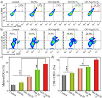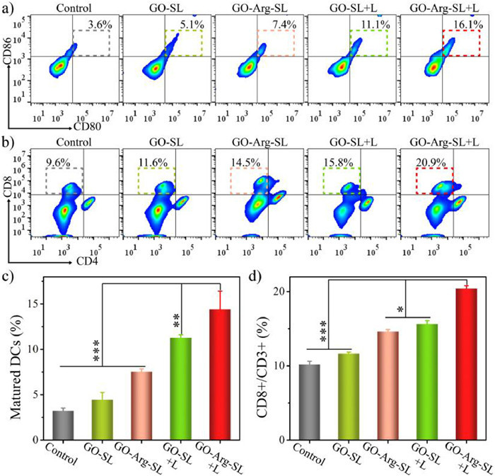 | Fig. 6. Flow cytometry analysis of (a, c) mature DCs maturation (CD80+CD86+ gated on CD11c+) in the tumor draining lymph node and (b, d) CTLs (CD8+CD4− gated on CD3+) in the spleen after 7 days treatments of PBS+L (control), GO-SL, GO-Arg-SL, GO-SL+L and GO-Arg-SL+L. ***P < 0.001, **P < 0.01, and P < 0.05. Data above are presented as means with standard deviations (mean ± SD, n = 4). | |