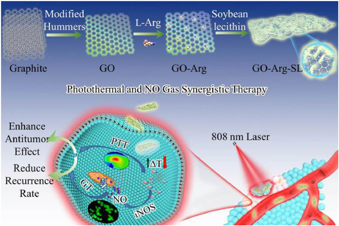 Herein, we have successfully fabricated GO nanomaterials via a modified Hummers' strategy. Then, the formed carboxyl group on GO surface and large specific surface area facilitate L-Arg loading (GO-Arg). Lastly, the surface of GO-Arg nanogenerator was then functionalized with soybean lecithin (SL) to improve its hydrophilic capability and biocompatibility (Scheme 1). After intravenous injection into 4T1 breast tumor-bearing mice, the resultant GO-Arg-SL nanogenerator could be effectively accumulated at the tumor sites by EPR (enhanced permeability and retention) effect and then efficiently internalized by tumor cells. Moreover, L-Arg could be efficaciously released in the cytoplasm of tumor cells then it was catalyzed by iNOS to generate massive NO for GT. Meanwhile, GO nanomaterial can act as a photothermal agent for hyperthermia generation. Therefore, tumors were remarkably eliminated attributed to the enhanced antitumor effect of PTT and GT. More importantly, this nanogenerator can efficiently cut down on the tumor recurrence rate due to the ICD (immunogenic cell death) induced by NIR laser-triggered hyperthermia and the immune activation by abundant NO generation [40]. This synergistic therapy of our GO-Arg-SL nanogenerator holds great potential for eradicating malignant tumors in clinical.