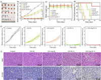 | Fig. 5. (a) Photographs of resected tumors after various treatments for 18 days. The red dotted rectangle represented the disappeared tumors. (b) Tumor volume curves, (c) body weights fluctuation, (d) survival rates, (e) tumor volume curves of each mouse with different treatments. (f) H & E and TUNEL staining images of tumor after various treatments for 18 days. ***P < 0.001 and **P < 0.01. Data above are presented as means with standard deviations (mean ± SD, n = 5). | |