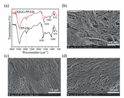 | Fig. 1. (a) FTIR spectra of PPAM and OQGG-PPAM; SEM images of PPAM (b), 1.5% OQGG-PPAM (c) and GA-PPAM (d). | |