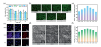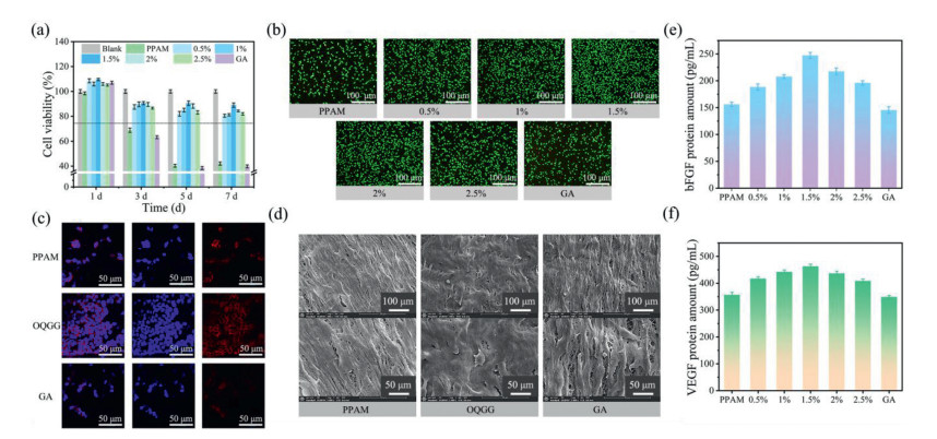 | Fig. 3. (a) Cell viability of L929 fibroblast cell co-cultured with PPAM, 0.5%-2.5% OQGG-PPAMs and GA-PPAM at 1 d, 3 d, 5 d, 7 d (T = 37 ℃); (b) Calcein AM/PI fluorescence staining images of L929 fibroblasts cultured for 4 d on PPAM, 0.5%-2.5% OQGG-PPAMs and GA-PPAM (T = 37 ℃, the live cells fluoresce green and dead cells fluoresce red); (c) Fluorescence microscopy images of L929 fibroblasts co-cultured for 4 d with PPAM, 1.5% OQGG-PPAM and GA-PPAM (T = 37 ℃); (d) SEM photographs of L929 fibroblasts cultured for 4 d on PPAM, 1.5% OQGG-PPAM and GA-PPAM (T = 37 ℃); The effect of PPAM, 0.5%-2.5% OQGG-PPAMs and GA-PPAM on (e) bFGF and (f) VEGF secretion from L929 fibroblasts. | |
