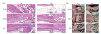 | Fig. 4. (a) After 1 M and 3 M post-operation, H & E analysis of various implanted samples (red arrow: blood vessel; blue arrow: inflammatory cells; the black dotted circle: implant); (b) Images of sample-adhesion. | |