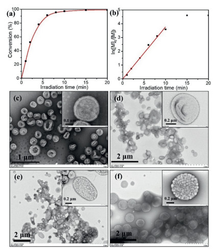 | Fig. 1. (a) Polymerization kinetics of photoinitiated RAFT seeded emulsion polymerization of MTEMA (target DP of 300) using mPEG113-PHPMA400 vesicles as seeds. (b) Plots of ln([M]0/[M]) vs. irradiation time derived from the data of Fig. 1a. (c) TEM image of mPEG113-PHPMA400 vesicles prepared by aqueous photoinitiated RAFT dispersion polymerization. TEM images of mPEG113-PHPMA400-PMTEMAn vesicles prepared by photoinitiated RAFT seeded emulsion polymerization of MTEMA: (d) n = 100, (e) n = 200, (f) n = 300. | |