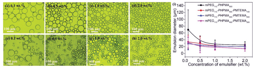| Fig. 2. Optical microscopy images of emulsions stabilized with different concentrations of (a-d) mPEG113-PHPMA400 vesicles and (e-h) framboidal mPEG113-PHPMA400-PMTEMA300 vesicles. (i) Evolution of diameter of emulsions with the concentration of mPEG113-PHPMA400-PMTEMAn (n = 0, 100, 200, 300) vesicles for hexane-in-water Pickering emulsion. | |