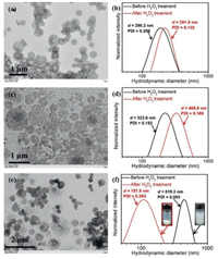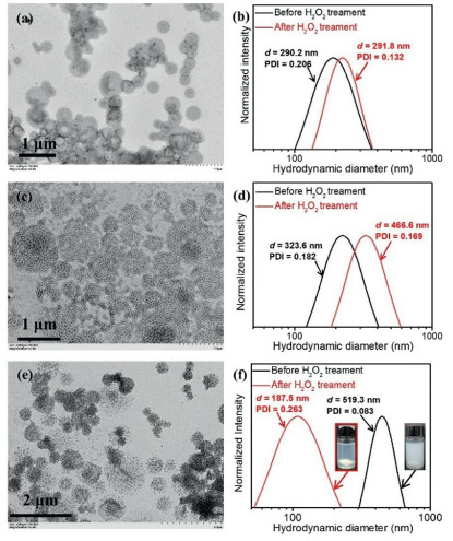 | Fig. 3. (a, c, e) TEM images of mPEG113-PHPMA400-PMTEMAn (n = 100, 200, 300) vesicles after treating with H2O2 for 24 h and (b, d, f) DLS particle size distributions of mPEG113-PHPMA400-PMTEMAn (n = 100, 200, 300) vesicles before and after treating with H2O2 for 24 h: (a, b) n = 100, (c, d) n = 200, (e, f) n = 300. | |