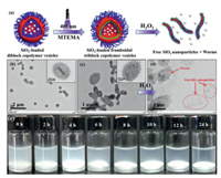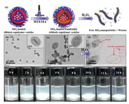 | Fig. 4. (a) Schematic illustration for the preparation of silica nanoparticles-loaded framboidal vesicles and the subsequent release of silica nanoparticles with the addition of H2O2. (b) TEM image of silica nanoparticles-loaded mPEG113-PHPMA400 vesicles. (c) TEM image of silica nanoparticles-loaded framboidal mPEG113-PHPMA400-PMTEMA300 vesicles. (d) TEM image of the sample after treating silica nanoparticles-loaded framboidal mPEG113-PHPMA400-PMTEMA300 vesicles with H2O2 for 24 h. (e) Digital images of aqueous dispersions of silica nanoparticles-loaded framboidal mPEG113-PHPMA400-PMTEMA300 vesicles after the addition of H2O2 at different times. | |