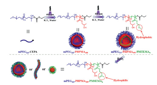 In summary, we demonstrate the preparation of oxidation-responsive framboidal triblock copolymer vesicles by photoinitiated RAFT seeded emulsion polymerization of MTEMA using mPEG113-PHPMA400 vesicles as seeds. The obtained framboidal vesicles could serve as efficient emulsifiers for Pickering emulsion. Moreover, these framboidal vesicles exhibited oxidation-responsive properties and could transform into worms or spheres in the presence of H2O2 for controlled release of silica nanoparticles.