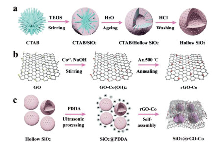 | Fig. 1. Schematic diagram of preparing (a) SiO2, (b) rGO–Co and (c) SiO2@rGO–Co. | |