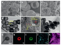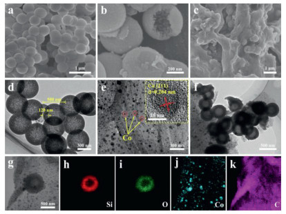 | Fig. 2. SEM images of (a, b) pure SiO2, (c) SiO2@rGO composite. TEM images of (d) pure SiO2, (e) rGO–Co composite, (f) SiO2@rGO–Co composite. (g) TEM image and (h-k) elemental mapping results of SiO2@rGO–Co composite. | |