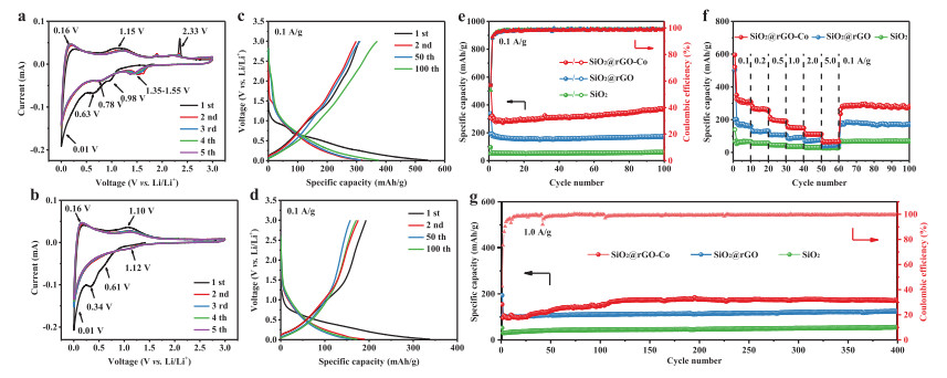 | Fig. 4. (a) CV curves of SiO2@rGO–Co. (b) CV curves of SiO2@rGO. (c) Charge/discharge curves of SiO2@rGO–Co. (d) Charge/discharge curves of SiO2@rGO. (e) Cycling performance of SiO2@rGO–Co, SiO2@rGO and pure SiO2 at 0.1 A/g. (f) Rate performance of SiO2@rGO–Co, SiO2@rGO and pure SiO2. (g) Cycling performance of SiO2@rGO–Co, SiO2@rGO and pure SiO2 at 1.0 A/g. | |