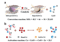 | Fig. 5. (a) Schematic diagram of Co-catalyzed SiO2 conversion reaction. (b) Mechanism diagram of Co particles activating Li2O. | |