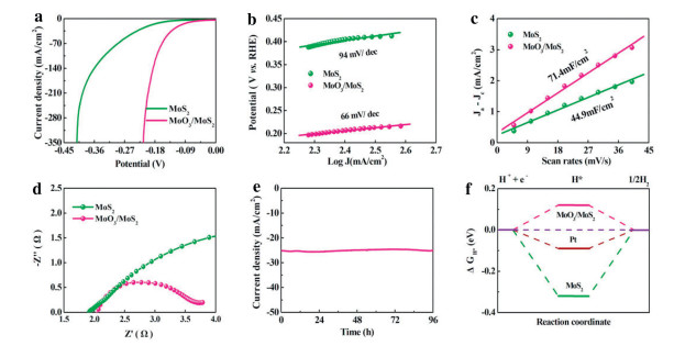 | Fig. 4. (a) LSV curves; (b) Tafel slopes of MoO3/MoS2 and MoS2 in 1 mol/L KOH. (c) Capacitive current as function of scan rates for MoO3/MoS2 and MoS2 in 1 mol/L KOH. (d) EIS of MoO3/MoS2 and MoS2. (e) Chronoampero-metric test of MoO3/MoS2 in 1 mol/L KOH. (f) Calculated ΔGH* for MoO3/MoS2, MoS2 and Pt. | |
