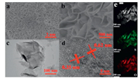 | Fig. 2. (a, b) SEM images of MoO3/MoS2. (c) TEM image of MoO3/MoS2. (d) High resolution TEM image of MoO3/MoS2. (e) Annular dark-field TEM image and S, O elemental mapping of MoO3/MoS2. | |