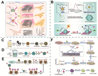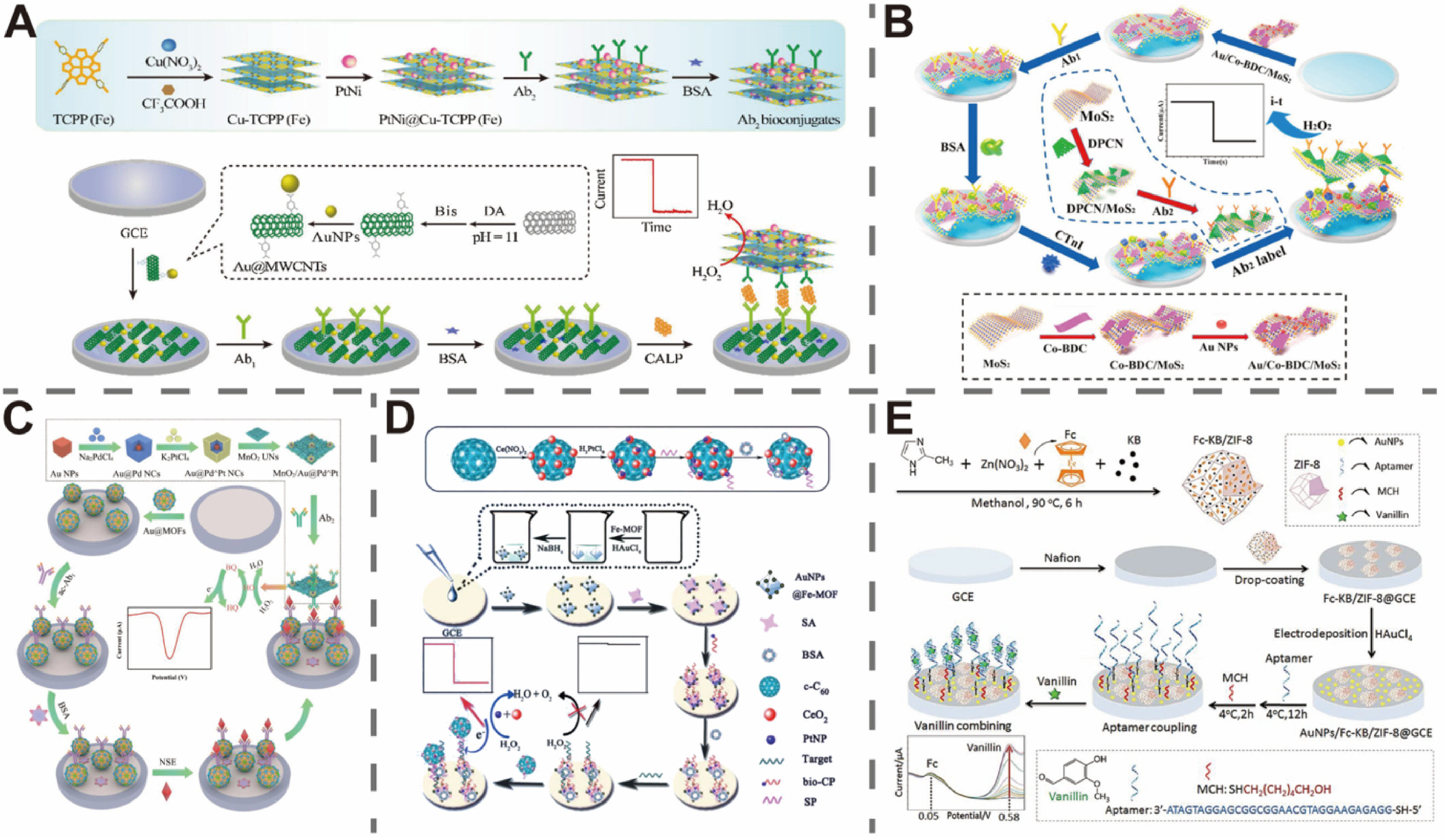 | Fig. 2. (A) The preparation procedure of PtNi@Cu-TCPP(Fe)-Ab2 bioconjugates and schematic illustration of the construction process of the sandwich electrochemical immunosensor. Reproduced with permission [59]. Copyright 2020, Elsevier. (B) Schematic illustration of the preparation of Au/Co-BDC/MoS2 immunosensor. Reproduced with permission [60]. Copyright 2021, Elsevier. (C) Schematic illustration of the preparation process of MnO2 UNs/Au@Pd^Pt NCs-Ab2 and fabrication procedure of the immunosensor. Reproduced with permission [61]. Copyright 2020, American Chemical Society. (D) The preparation process of the c-C60/CeO2/PtNPs/SP signal probes and schematic illustration of the assembly procedure of the electrochemical biosensor. Reproduced with permission [64]. Copyright 2018, Elsevier. (E) Schematic illustration of the fabrication of a proposed aptasensor based on AuNPs/Fc-KB/ZIF-8 for detecting vanillin. Reproduced with permission [66]. Copyright 2019, Elsevier. | |