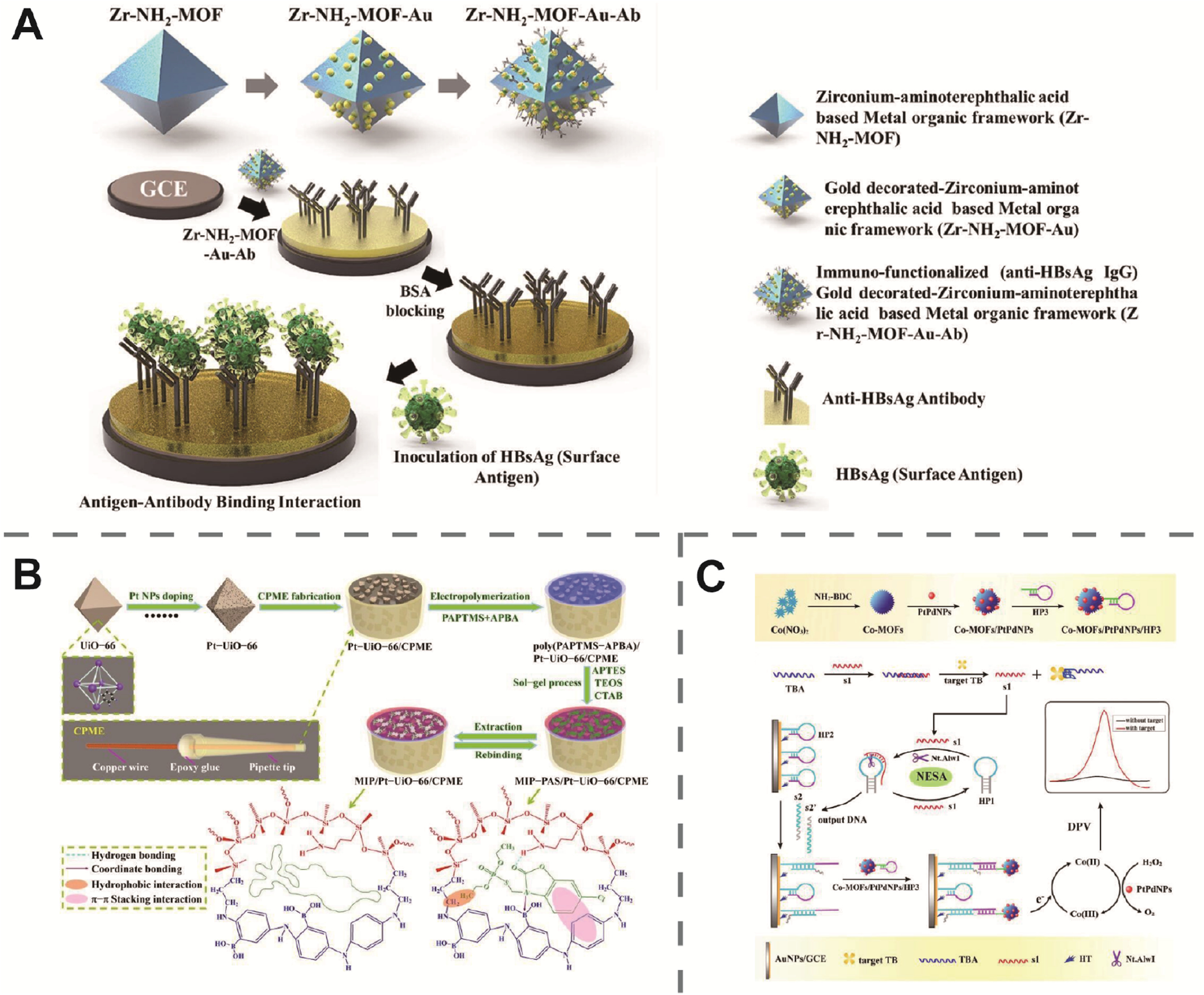 | Fig. 3. (A) Schematic representation of the synthesis of Au@UiO-66(NH2)-based immuno-electrochemical sensing for the detection of hepatitis B virus surface antigen. Reproduced with permission [68]. Copyright 2021, Springer. (B) Schematic illustration of the fabrication of MIP/Pt-UiO-66/CPME and MIP-PAS/Pt-UiO-66/CPME and their molecular structure. Reproduced with permission [76]. Copyright 2020, Royal Society of Chemistry. (C) Schematic illustration of the preparation of Co-MOFs/PtPdNPs/HP3 and the detection principle for thrombin. Reproduced with permission [94]. Copyright 2017, American Chemical Society. | |