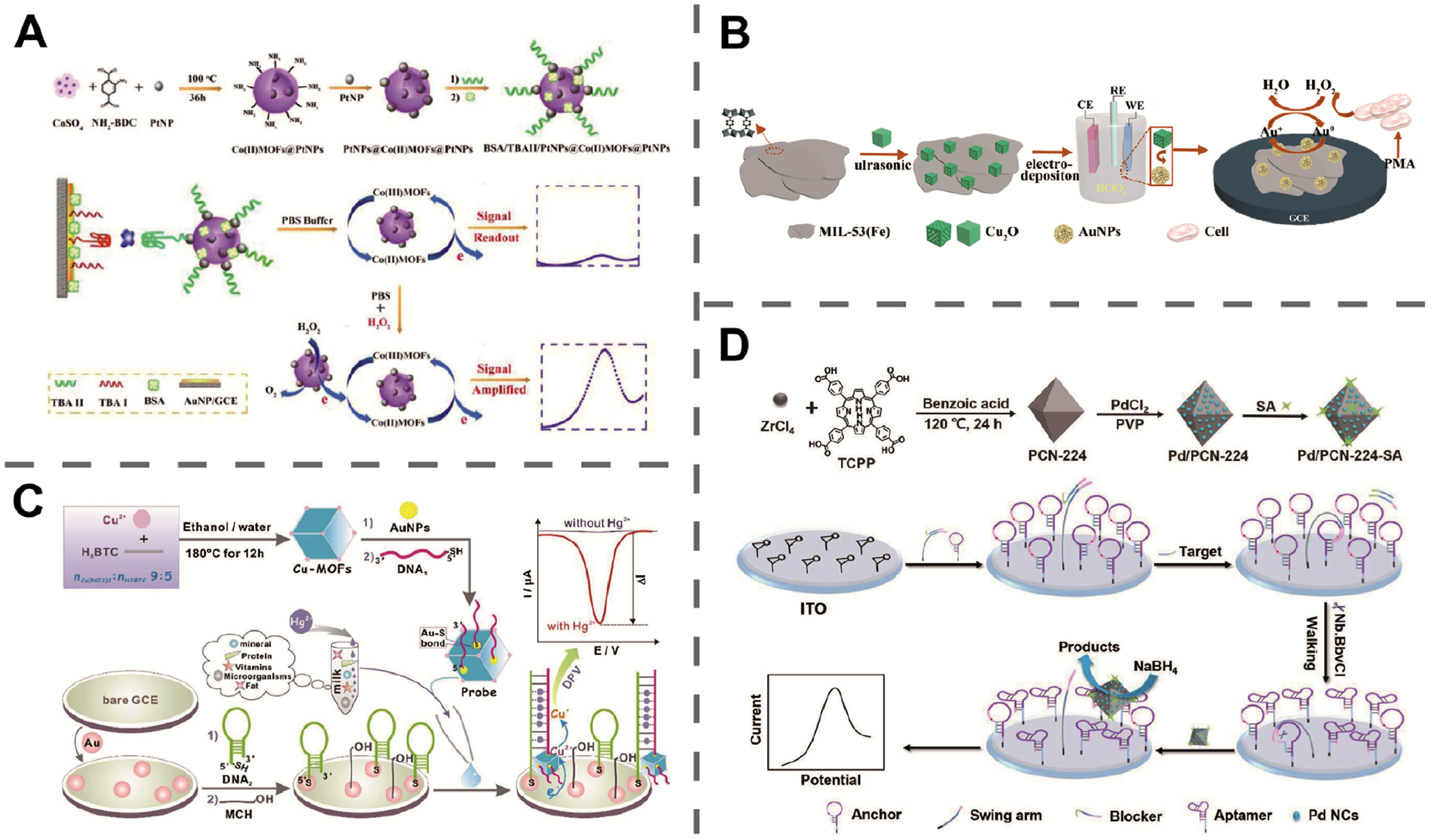 | Fig. 4. (A) Principle description of preparation of TBA II bioconjugates and the signal amplification of thrombin detection. Reproduced with permission [109]. Copyright 2017, Elsevier. (B) Schematic illustration of the preparation process of Au@Cu2O-MIL-53(Fe) for real-time monitoring of H2O2 released from the living cells. Reproduced with permission [113]. Copyright 2021, Springer. (C) Schematic illustration of the probe design and the DNA sensor for Hg2+ assay using the optimal Cu-MOFs as signal output and T-Hg2+-T coordination chemistry. Reproduced with permission [114]. Copyright 2020, Elsevier. (D) Schematic illustration of the preparation of an immunosensor based on Pd/PCN-224-SA and construction of DNA walker substrate on the indium tin oxide (ITO) electrode. Reproduced with permission [116]. Copyright 2018, American Chemical Society. | |